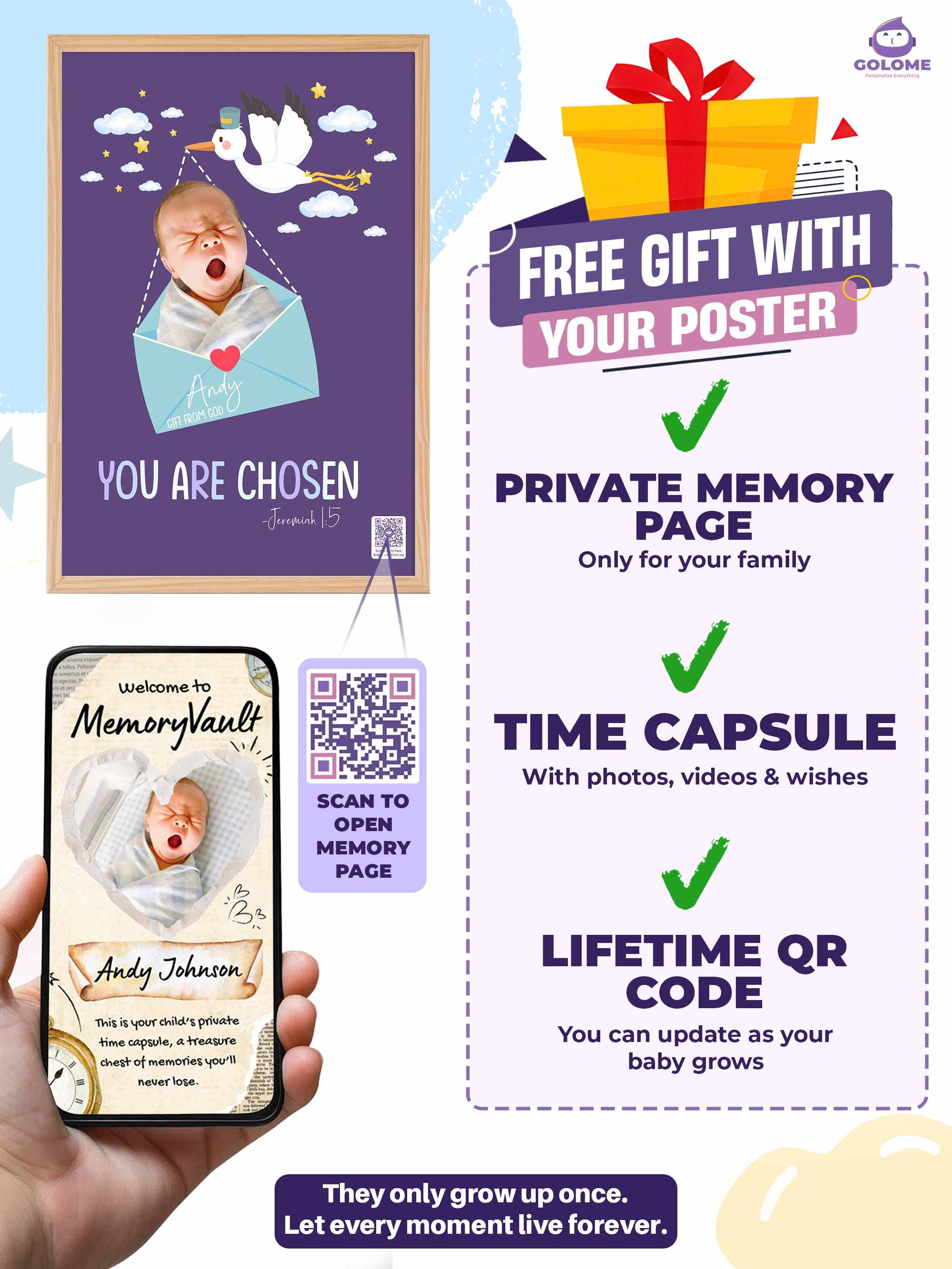 Celebrate your baby’s arrival with this personalized “You Are Chosen” poster, inspired by Jeremiah 1:5 – “Before I formed you in the womb I knew you.” Featuring your child’s photo and name in a sweet stork design, this artwork makes a meaningful faith-based keepsake.